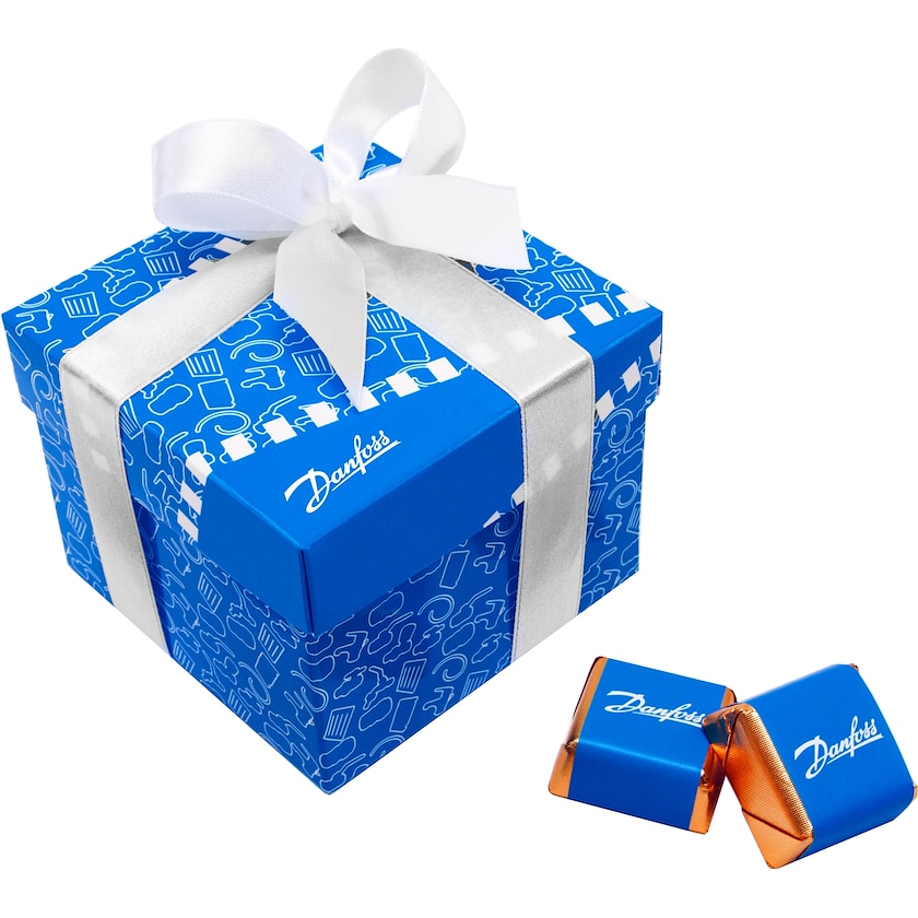 Coffret de chocolats rempli de 16 pralines au chocolat fourrées. Les pralines au chocolat sont disponibles dans l'une des saveurs chocolat, pistache et saveurs mélangées. La boîte de chocolats ainsi que les banderoles autour des pralines au chocolat sont fournies avec votre impression. La boîte de chocolats est également munie d'un ruban de soie de n'importe quelle couleur.