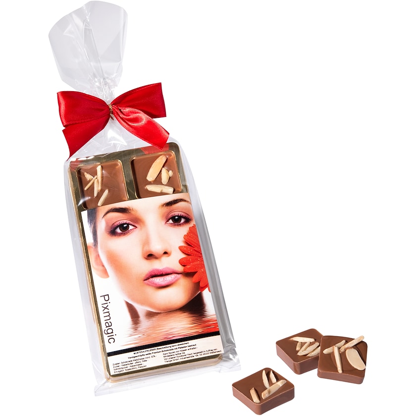 8 morceaux de chocolat faits à la main dans un sachet avec un nœud rouge. Les morceaux de chocolat sont disponibles dans l'une des saveurs chocolat au lait aux éclats d'amandes ou chocolat au lait aux pistaches. Les morceaux de chocolat sont placés dans une boîte blister de couleur dorée. L'impression a lieu sur la boîte blister.