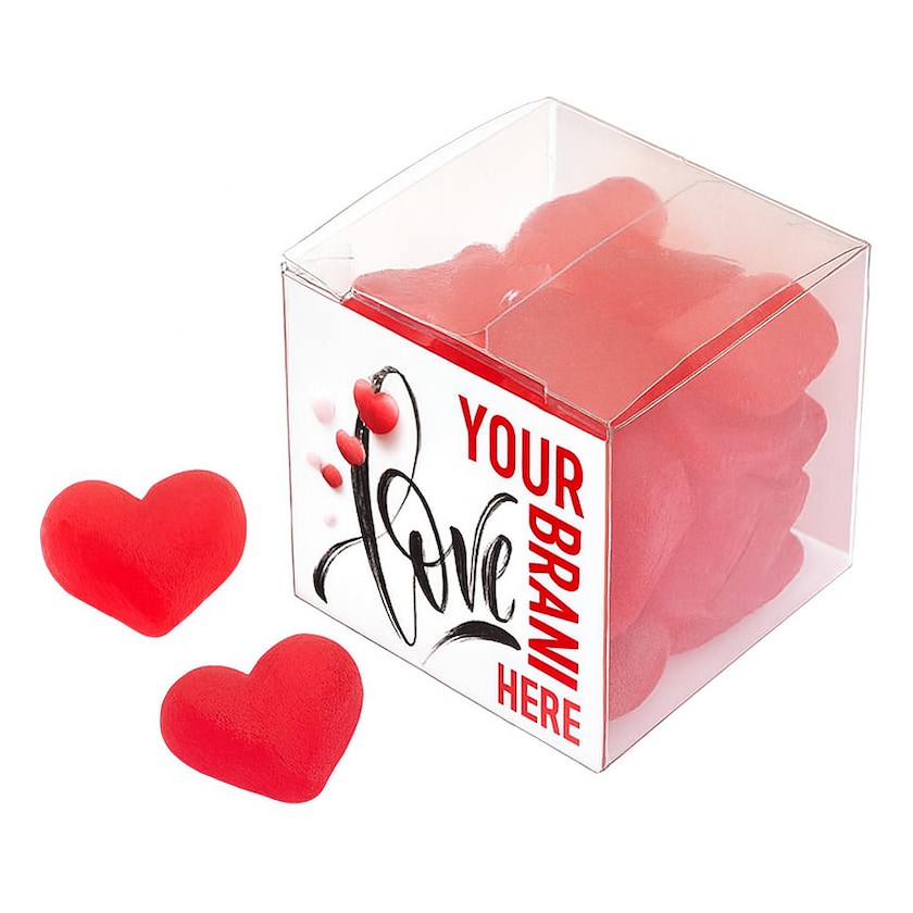 Grand paquet de délicieux cœurs en gelée. L'emballage transparent est muni d'étiquettes imprimées en 4 couleurs sur deux faces opposées.