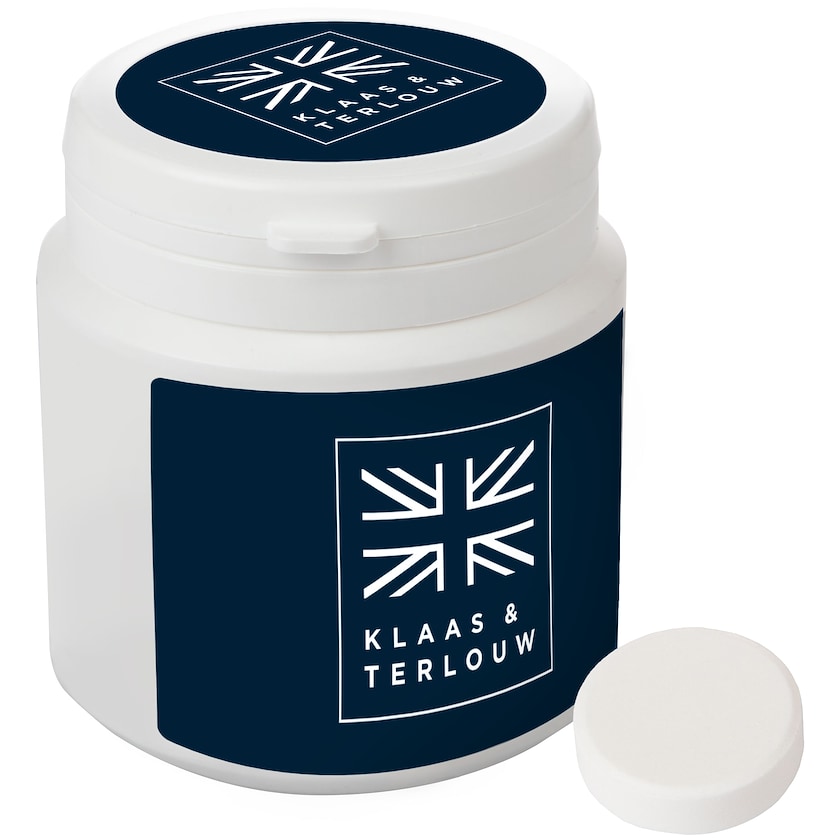 Pot rempli de 160 grammes de comprimés de menthe. Des étiquettes avec votre impression sont placées sur la boîte et sur le couvercle de la boîte.