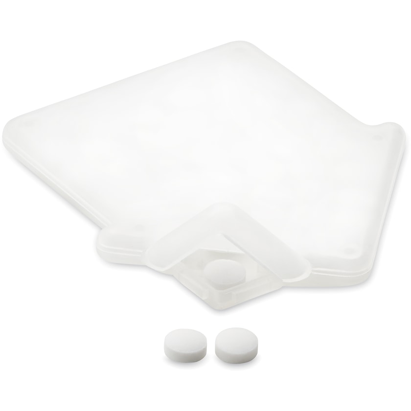 Carte fraîche en forme de maison avec pastilles de menthe sans sucre. Choisissez entre du plastique blanc ou transparent.