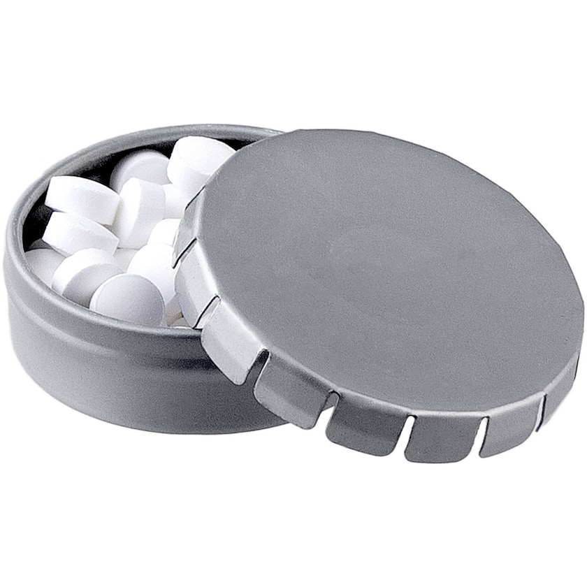 Petite boîte clic-clac avec 5 grammes de bonbons à la menthe. Choisissez parmi deux couleurs. La boîte s'ouvre en appuyant au milieu du couvercle. Un classique des bonbons publicitaires.