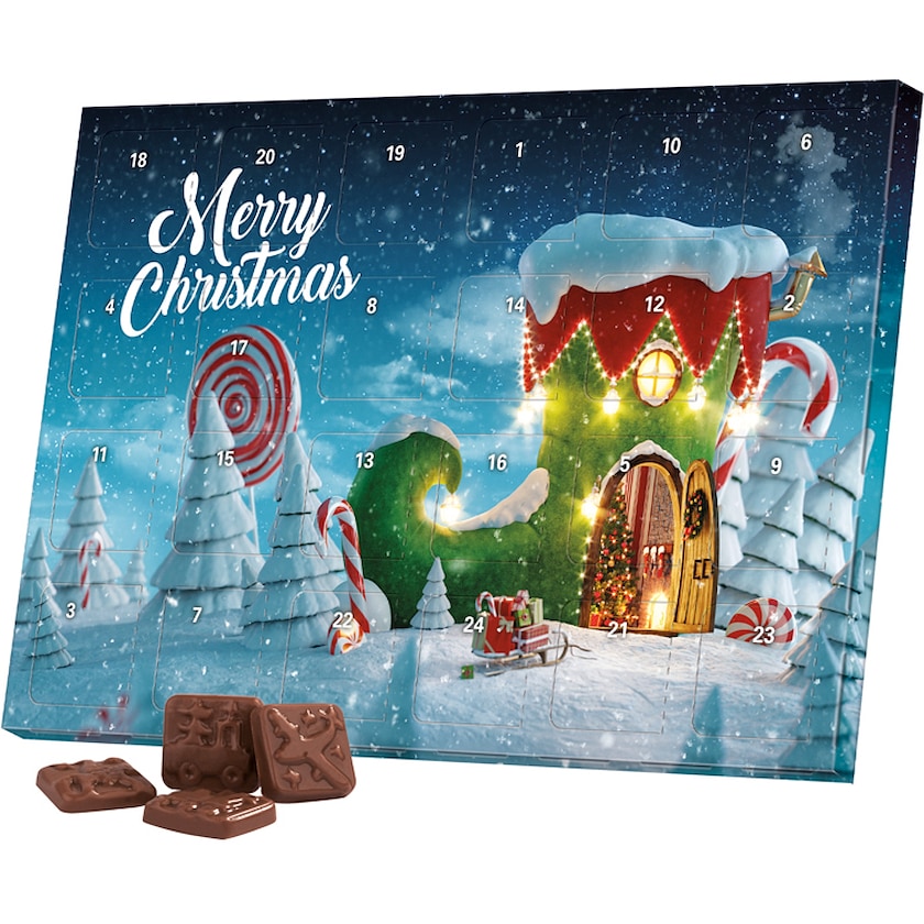 Un calendrier de l'Avent pour le bureau contenant de délicieux chocolats Fairtrade. Les chocolats sont de délicieux chocolats au lait crémeux. Grâce à son support à l'arrière, le calendrier de l'Avent peut être installé sur un bureau.