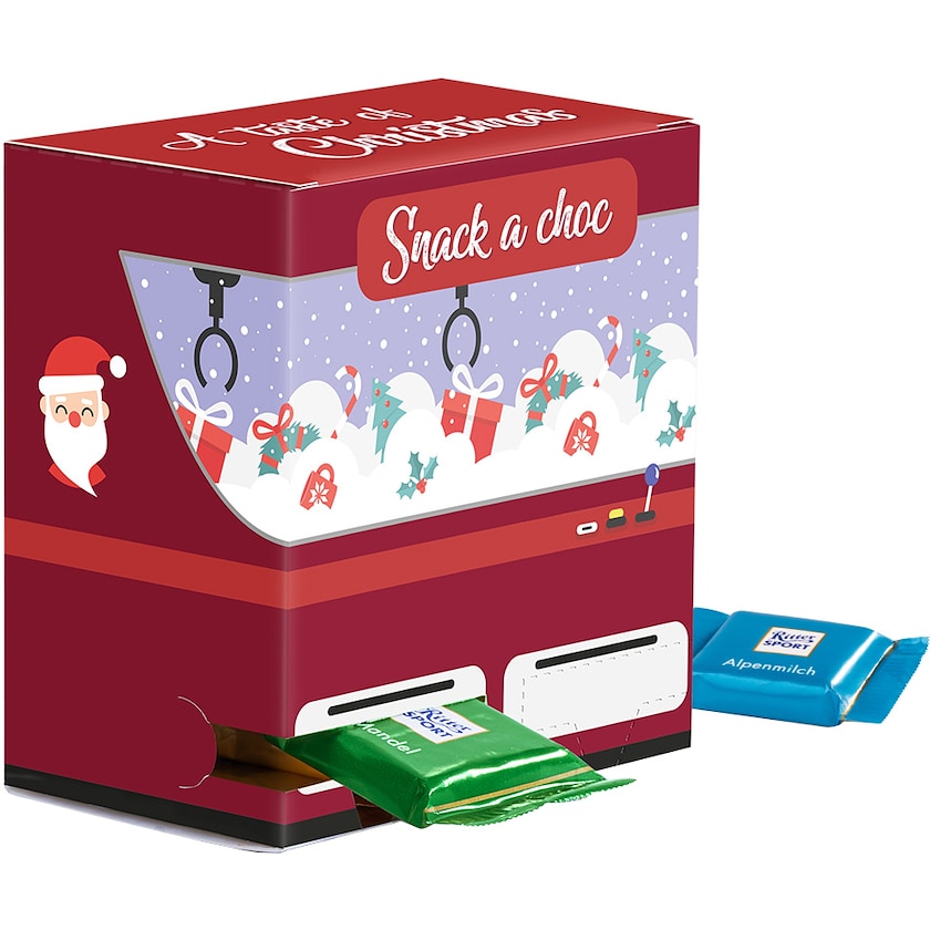 Calendrier de l'avent original rempli de chocolats Ritter Sport. Ce calendrier de l'avent ne comporte pas de cases numérotées, il suffit de prendre un chocolat Ritter Sport chaque jour pendant 24 jours. Le calendrier de l'avent est 100% en carton certifié FSC.