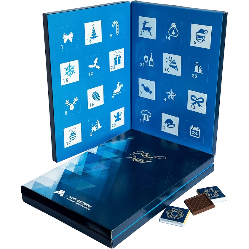 Calendrier de l'Avent en forme de livre avec carrés de chocolat imprimés. Le calendrier de l'Avent lui-même ainsi que les carrés de chocolat sont imprimés selon vos souhaits. Choisissez entre le chocolat au lait et le chocolat noir.