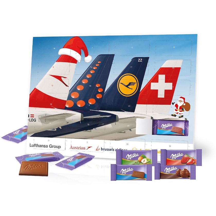 Calendrier de l'avent avec du délicieux chocolat Milka. La boîte est en carton certifié FSC, et l'intérieur est fabriqué en matériau recyclé. L'intégralité de la production est neutre pour le climat. Le calendrier de l'avent contient des chocolats aux goûts variés : Alpenmilch, Haselnuss, Crème au Cacao et Erdbeere.