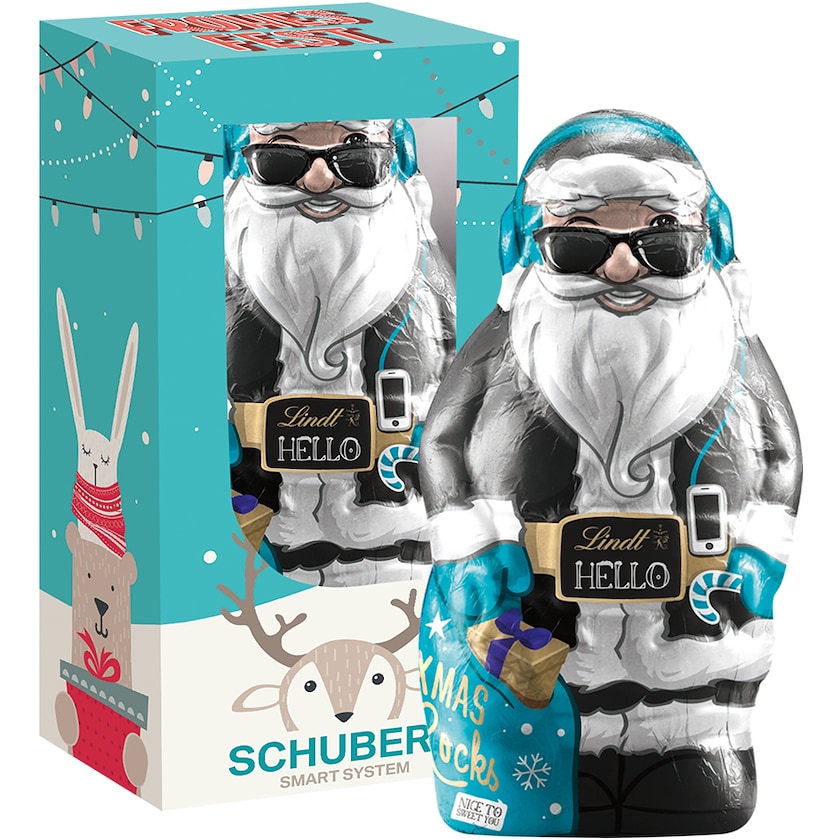 Père Noël en chocolat tendance Lindt de la série Hello. Le Père Noël en chocolat est fabriqué dans un délicieux chocolat au lait de la plus haute qualité. Les Pères Noël sont livrés dans des coloris rouges et bleus. L'intégralité de l'emballage est personnalisable suivant vos souhaits.