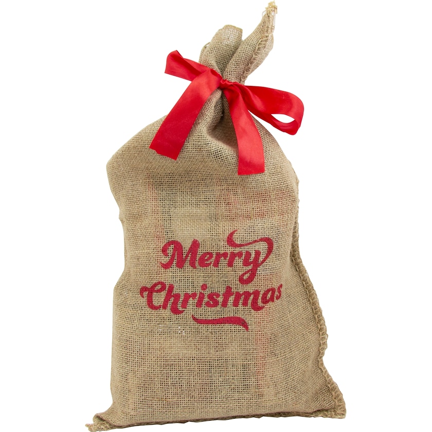 Grand sac en jute avec imprimé rouge "Merry Christmas". Le sac de jute contient des pépites de chocolat au lait, des gnomes en mousse, des pralines en pâte d'amande, des coupes au caramel, des crackers, des amandes au safran, du choco & plus et deux types de truffes au chocolat.