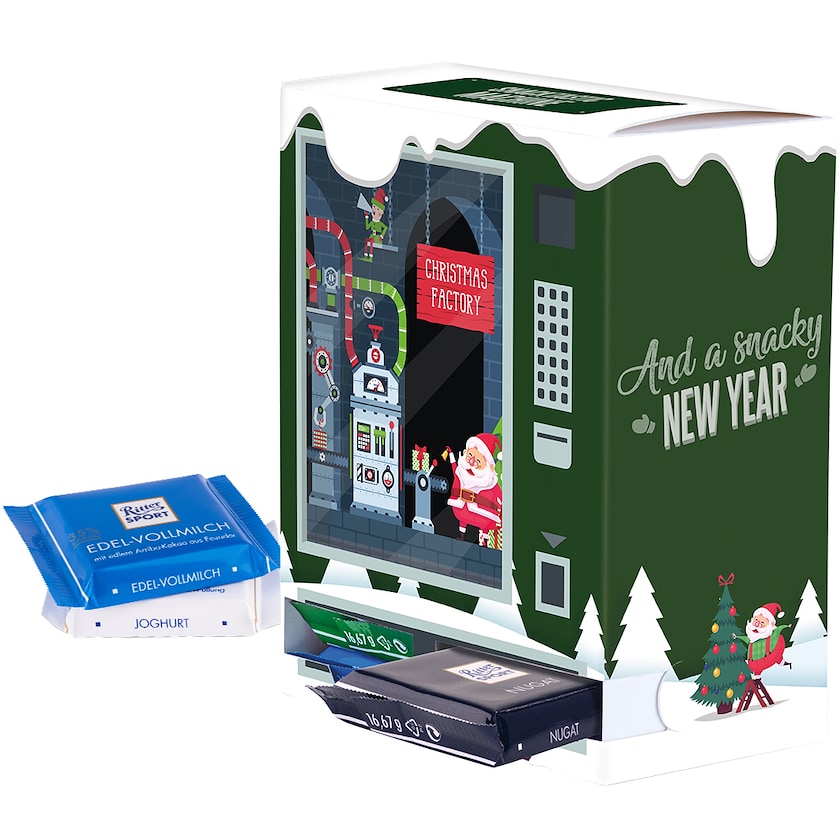 Calendrier de l'avent unique avec des chocolats Ritter Sport. Ce calendrier de l'avent ne comporte pas de cases traditionnelles numérotées, il suffit de prendre un chocolat chaque jour. Fabriqué en carton certifié FSC.