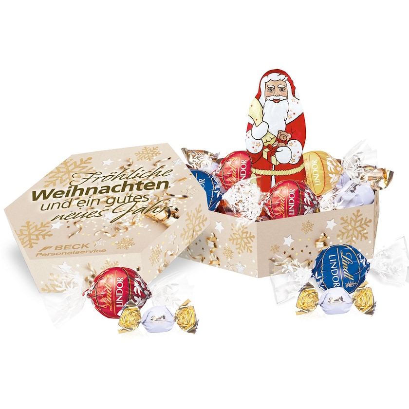 Boîte de chocolats haut de gamme Lindt. La Lindt Christmas Maxi Box contient 5 Lindt Lindor, 5 billes de chocolat au lait Lindt et 1 Père Noël en chocolat Lindt. Un cadeau de Noël Lindt pour les clients importants. L'intégralité de la boîte est personnalisable suivant vos souhaits.