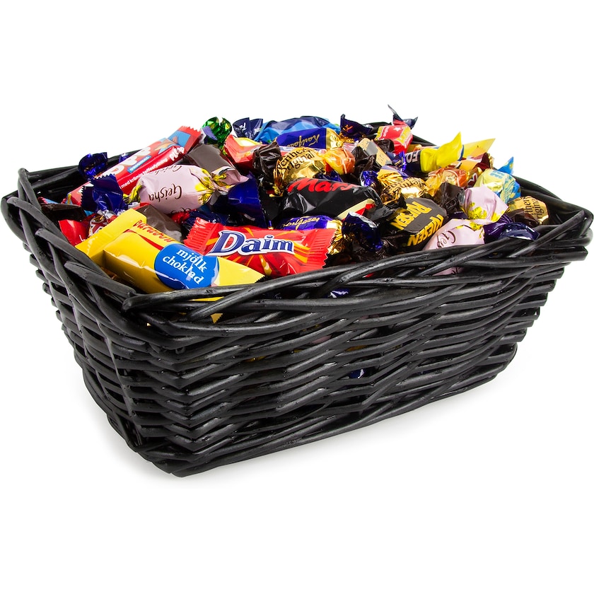 Panier noir avec bonbons emballés de qualité. Contient des classiques tels que Toblerone, Dumle, Geisha et Daim. Si vous le souhaitez, le panier peut être muni d'une carte de vœux.