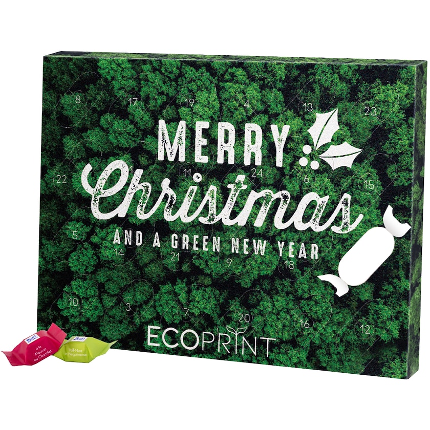 Calendrier de l'avent écologique avec des chocolats Ritter Sport. L'intégralité du calendrier de l'avent est fabriqué en carton, et est donc directement compostable. Le calendrier de l'avent est rempli de délicieux chocolats Ritter Sport Chocolates Cubes dans des goûts variés.