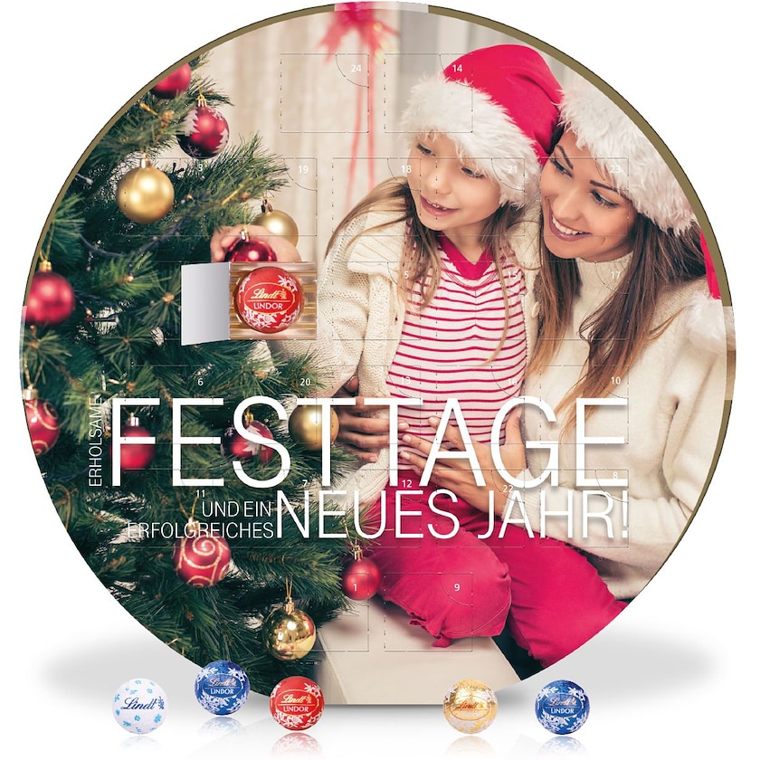 Calendrier de l'avent rond contenant 24 délicieux Lindt Minis. Le calendrier de l'avent est en carton certifié FSC fabriqué de façon neutre en carbone. Téléchargez le template d'impression et créez un calendrier de l'avent vraiment unique.