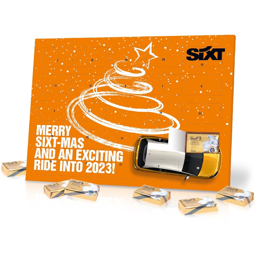 Calendrier de l'avent contenant des chocolats au lait Lindt. Le carton est certifié FSC, le revêtement intérieur est en matériau recyclé. À l'arrière, un support permet de faire tenir le calendrier sur une table, par exemple.