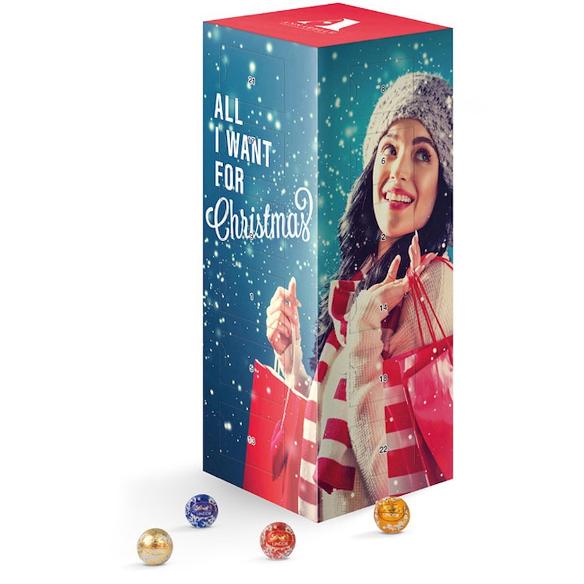 Calendrier de l'Avent rempli de 24 billes de chocolat Lindt. Les billes de chocolat ont des goûts différents. Le centre du calendrier permet d'y placer un cadeau de Noël. Le calendrier de l'Avent est fabriqué en carton recyclé.