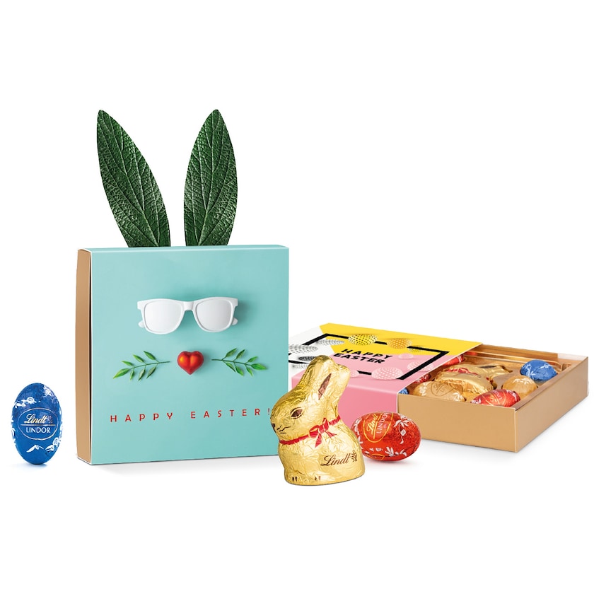 Boîte avec oreilles de lapin remplie de chocolats Lindt. Contient 6 œufs en chocolat Lindt, ainsi qu'un lapin en chocolat Lindt avec feuillet d'aluminium doré. Les oreilles de lapin et la housse en carton de la boîte sont entièrement personnalisables suivant vos souhaits.
