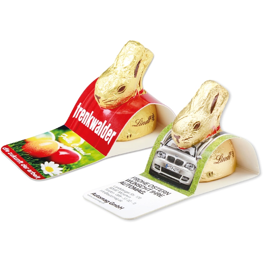 Lapin de Pâques Lindt avec étiquette en papier personnalisée. L'étiquette est fabriquée en papier certifié FSC et personnalisable entièrement suivant vos instructions. Le lapin de Pâques est fabriqué dans le plus fin des chocolats au lait. Un grand favori des fêtes de Pâques !