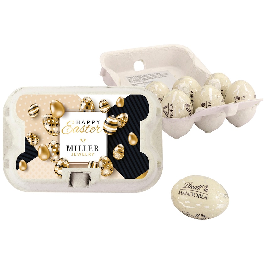 Boíte de 6 œufs en chocolat de type Lindt Mandorla. Les œufs en chocolat contiennent une délicieuse crème de lait d'amande. Le dessus de la boîte d'œufs est orné d'une étiquette imprimée en 4 couleurs entièrement suivant vos souhaits.