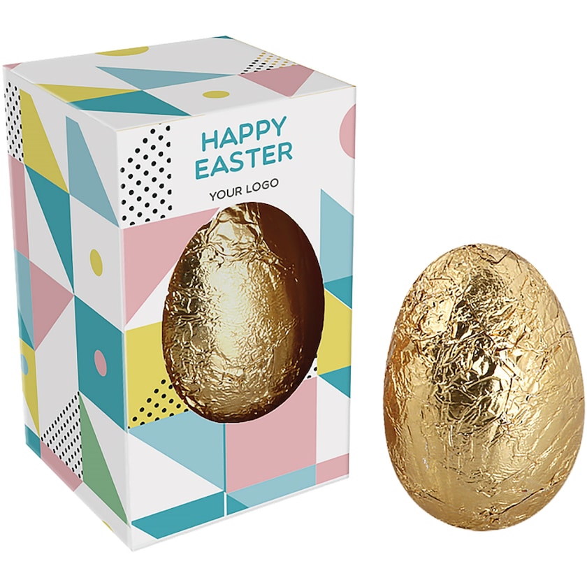 Œuf en chocolat avec papier d'aluminium doré. L'emballage est personnalisé intégralement suivant vos souhaits. Cet œuf en chocolat est fabriqué dans un chocolat au lait de qualité. Parfait pour les campagnes marketing de Pâques!