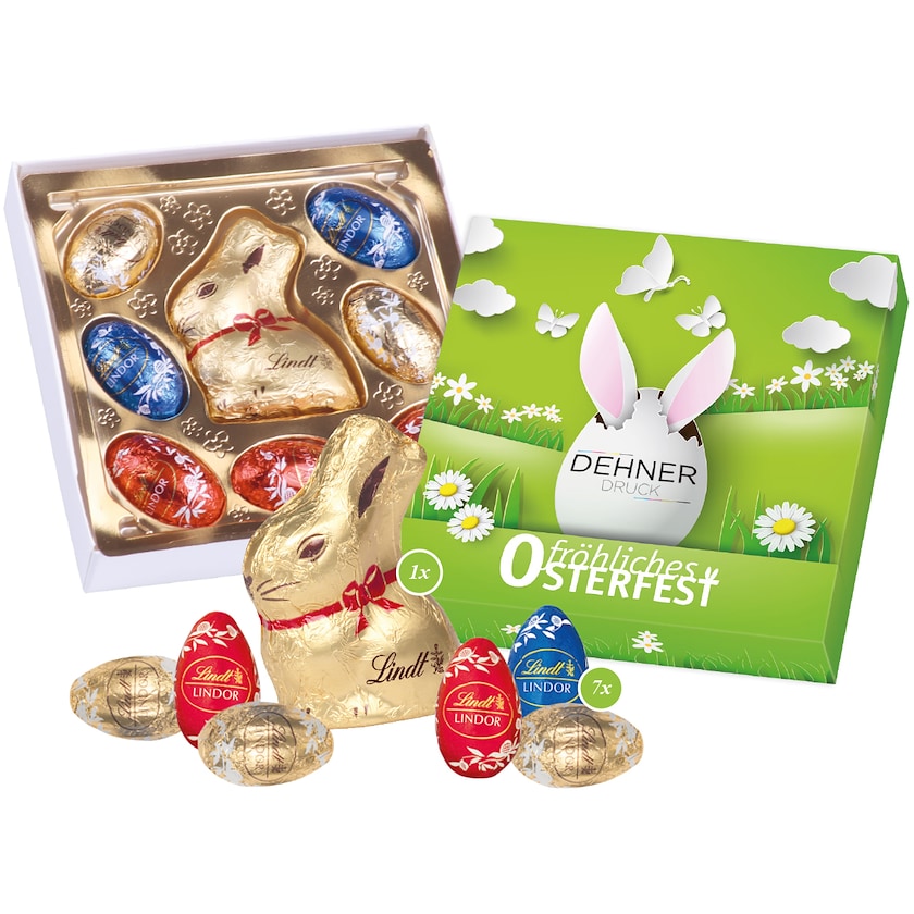 Boîte de chocolats de Pâques Lindt. Surprenez vos clients ! La boîte de chocolats est fabriquée dans un carton neutre pour le climat, certifié FSC, et contient 42 grammes de chocolat de première classe.