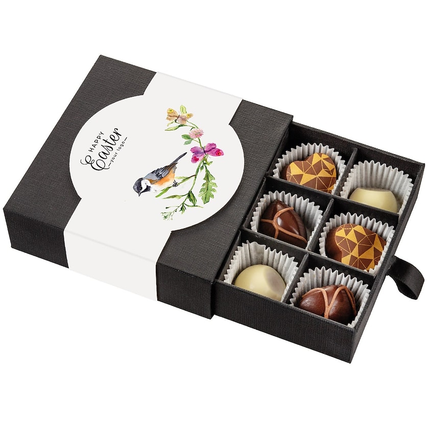 Luxueuse boîte de 9 chocolats. Les chocolats sont de la plus haute qualité et pèsent un total de 63 g. Un choix parfait pour vous qui recherchez une boîte de chocolats haut de gamme pour Pâques. L'impression est réalisée sur le manchon en papier entourant la boîte.