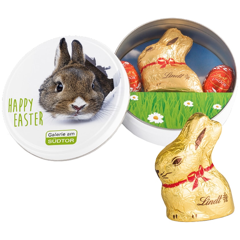 Boîte en fer blanc remplie de chocolats de Pâques haut de gamme Lindt. La boîte contient un lapin en chocolat Lindt de 10 grammes et deux œufs en chocolat Lindor de 5 grammes chacun, tous fabriqués dans le plus fin des chocolats au lait suisses. Le couvercle de la boîte en fer blanc est personnalisé entièrement suivant vos souhaits. À l'intérieur de la boîte, un "gazon" en papier maintient les chocolats en place.