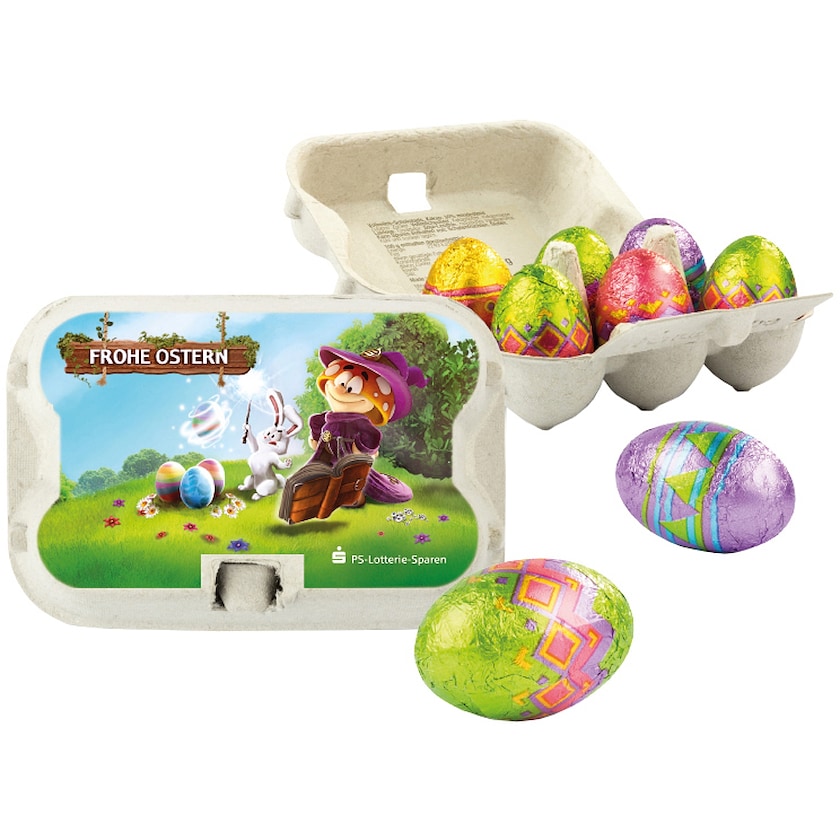 Boîte de 6 œufs au chocolat. Les œufs au chocolat pèsent 37 grammes en tout. Ils sont en chocolat au lait. La boîte d'œufs possède un couvercle pourvu d'une étiquette personnalisée par impression 4 couleurs.