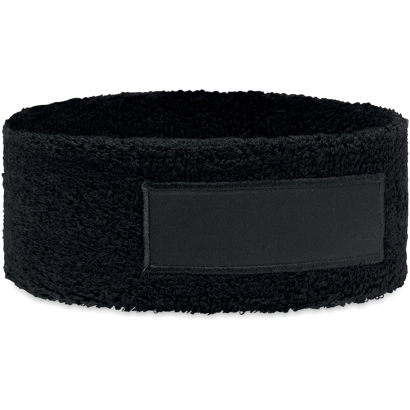 Bandeau en tissu éponge avec étiquette en tissu laissant de la place pour votre impression. Une façon amusante de promouvoir votre entreprise.