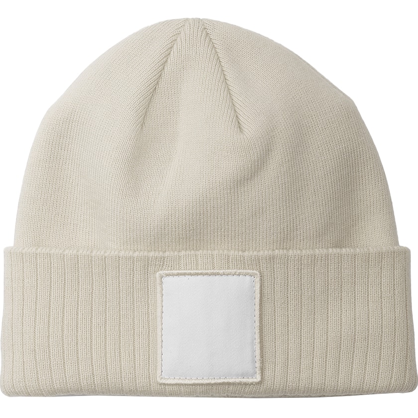 Chapeau écologique avec grande étiquette en tissu blanc. Le tissu du chapeau est composé à 100 % de polyester recyclé. L'étiquette peut être imprimée numériquement ou brodée.
