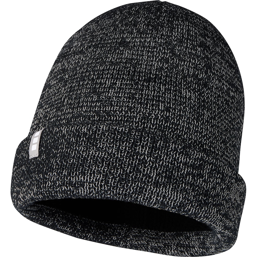 Bonnet en tissu réfléchissant. Le bonnet a un rabat et une petite étiquette qui indique la marque Elevate. La capacité réfléchissante du tissu n'est pas conçue pour remplacer des bandes réfléchissantes standard, mais peut agir comme un complément. La personnalisation est réalisée par broderie.