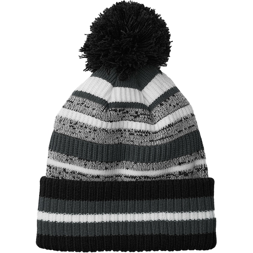 Bonnet écologique avec tissu rayé et grand pompon. Le chapeau est composé à 100 % de polyester recyclé certifié selon Control Union CU811033.