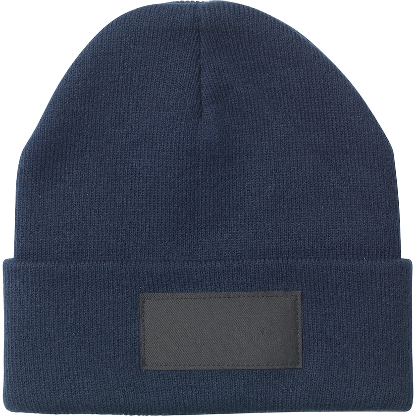 Bonnet tricoté personnalisable en matériau recyclé. Le tissu est en rPET, c'est-à-dire en bouteilles PET recyclées. L'impression est réalisée sur une étiquette cousue sur le devant du bonnet. Impression monochrome uniquement.