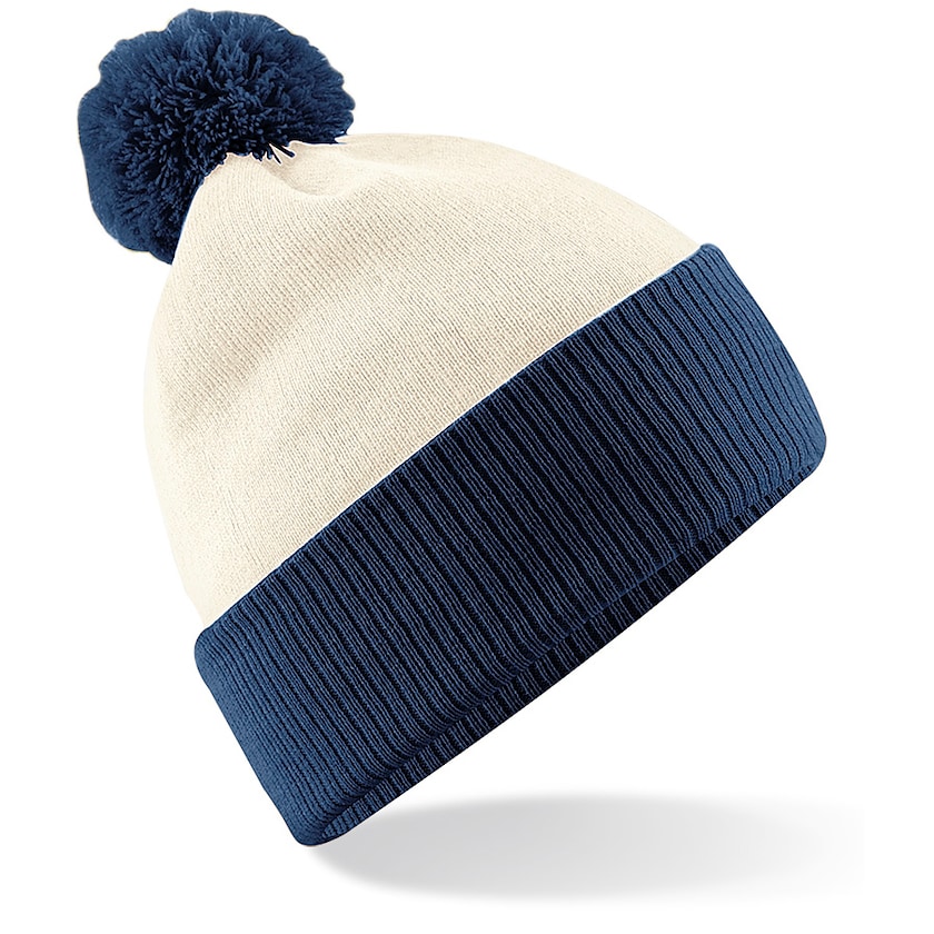 Joli bonnet bicolore avec rabat large et gros pompon.