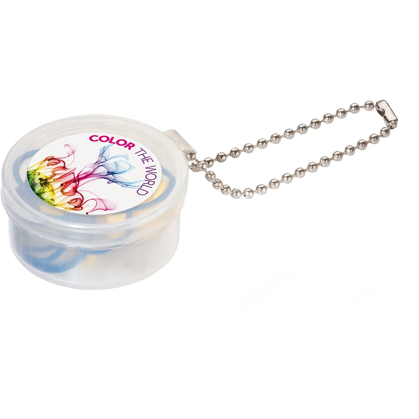 Petite boîte en plastique contenant des bouchons d'oreille avec étiquette imprimée en quadrichromie. La boîte en plastique est dotée d'une chaînette en métal. Les bouchons d'oreille sont reliés par un cordon qui permet de les avoir autour du cou lorsqu'on ne les utilise pas.