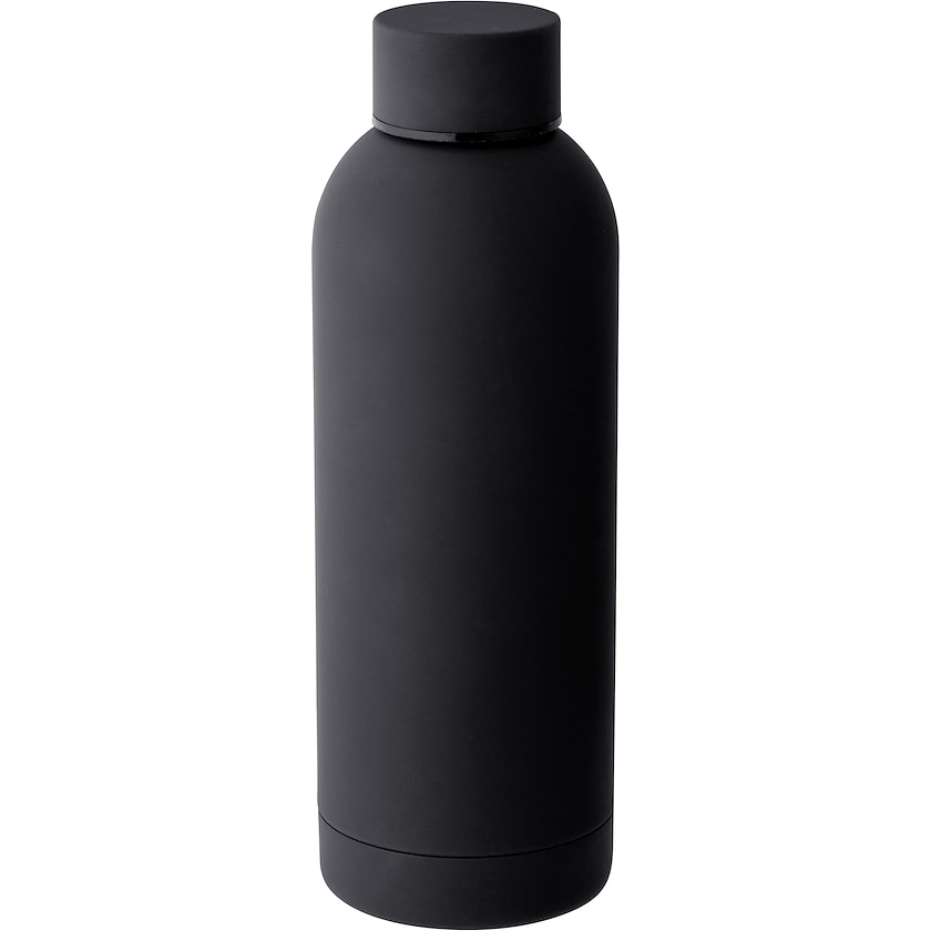 Gourde isotherme en acier inoxydable avec surface en caoutchouc. La gourde peut contenir 55 cl et possède un bouchon vissé. La personnalisation est réalisée par gravure laser. Livrée dans un emballage individuel dans une boîte cadeau noire.