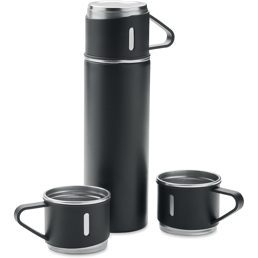 Thermos en acier inoxydable avec un total de trois tasses. Le thermos contient 42 cl et la tasse respective 15 cl. Sans fuite.