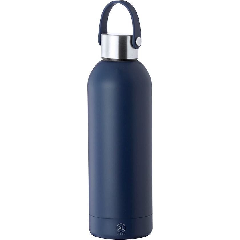 Gourde isotherme en acier inoxydable recyclé. Le bouchon est équipé d'une anse pratique. La personnalisation est réalisée soit par impression soit par gravure laser.