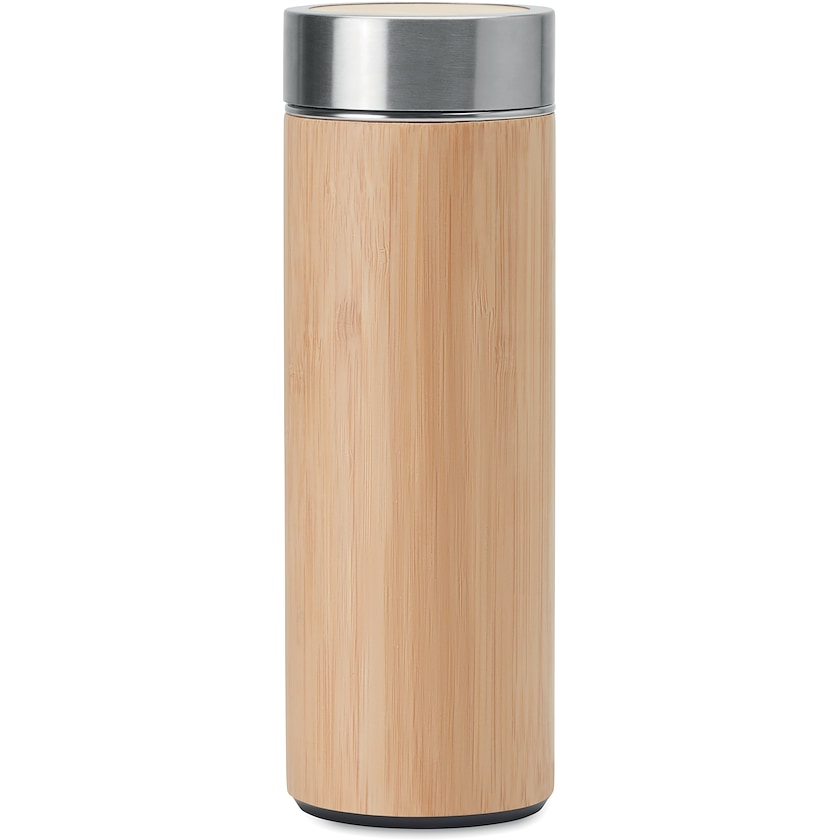 Gourde isotherme en acier inoxydable avec extérieur en bambou. À l'intérieur, la gourde comporte un infuseur à thé pour tous les amateurs. La gourde isotherme est à paroi double pour garder vos boissons vraiment chaudes.