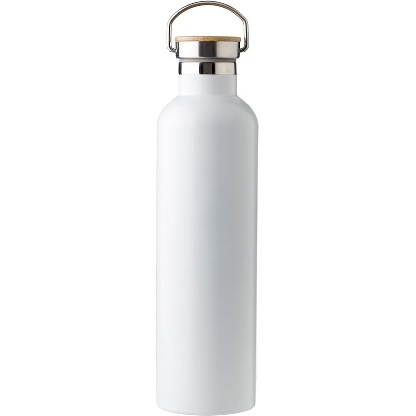 Grand thermos en acier inoxydable. Le thermos a des doubles parois et est isolé sous vide. Le dessus du couvercle est en bambou. Un beau thermos de grande qualité.