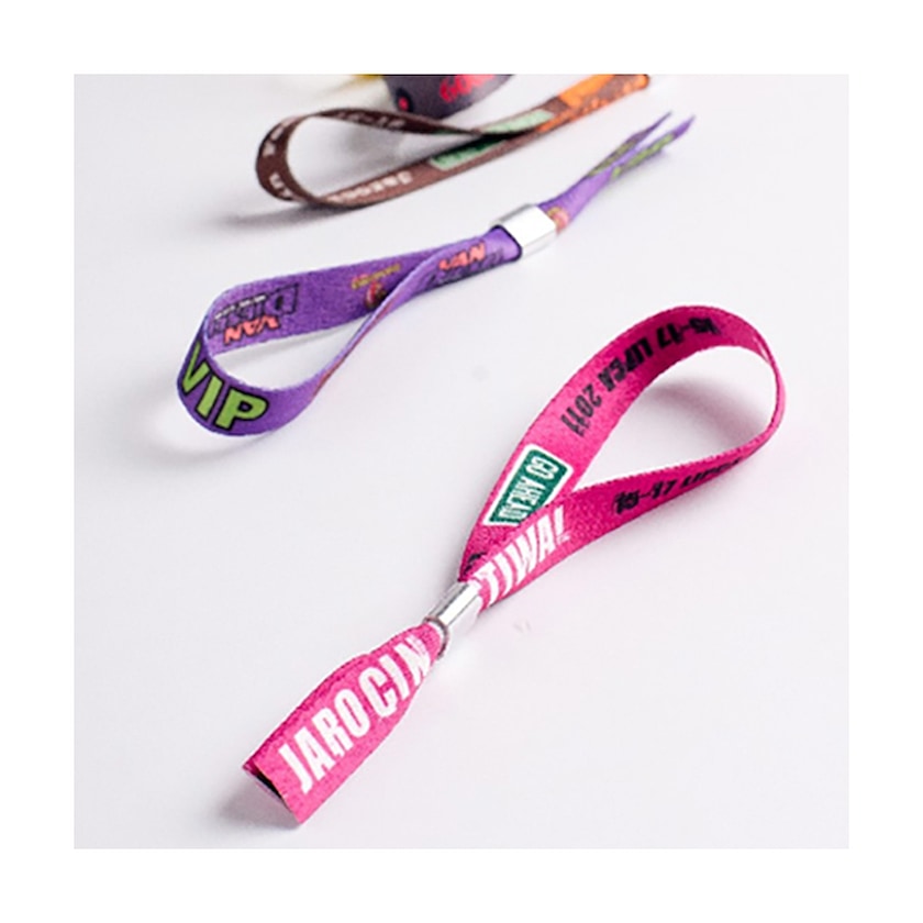 Bracelet en tissu tendance avec impression en quadrichromie des deux côtés. Le bracelet se ferme à l'aide d'un fermoir en aluminium inclus avec chaque bracelet. Le fermoir se ferme plus facilement à l'aide d'une pince qui peut être achetée comme accessoire séparé.