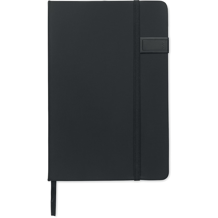 Ordinateur portable avec une clé USB de 16 Go. Le carnet est doté d'une couverture rigide et d'un intercalaire composé de 80 pages lignées de papier recyclé labellisé FSC. La couverture est en partie fabriquée à partir de matériaux recyclés.