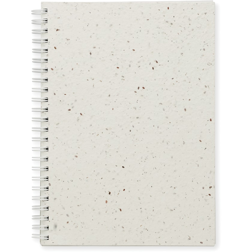 Cahier à spirales avec couverture en papier semence. L'intérieur se compose de 100 feuilles lignées fabriquées à partir de papier recyclé. Le papier de semence peut être planté et produit des fleurs variées.
