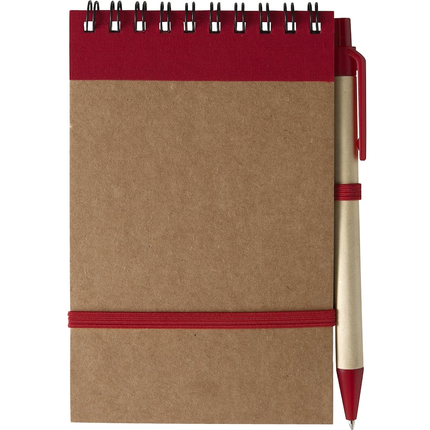 Bloc-note classique avec stylo bille. Le bloc-note est fermé par une bande élastique.
