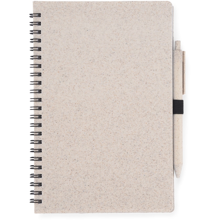Carnet à spirale écologique avec stylo. La couverture et le stylo sont fabriqués à partir de plastique de paille de blé respectueux de l'environnement et l'intérieur se compose de 70 feuilles à carreaux de papier recyclé.