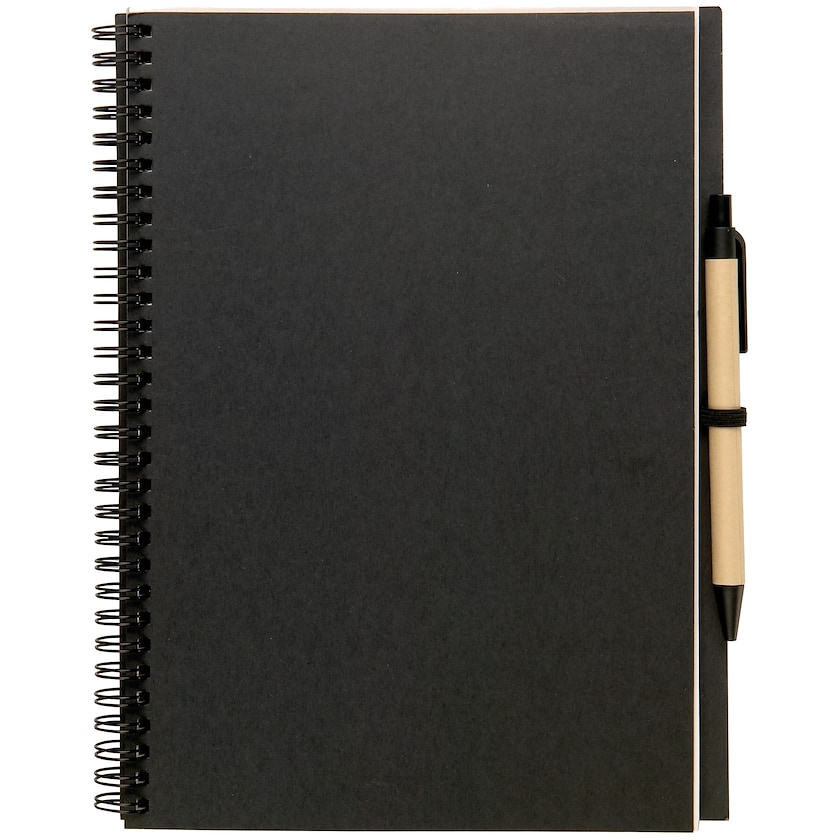 Cahier à spirale avec stylo. Le cahier compte 70 feuilles non lignées en papier recyclé. Le stylo est en matériau recyclé biodégradable.