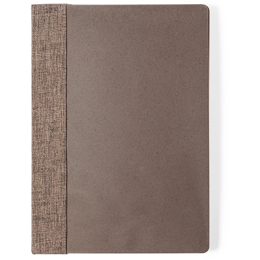 Cahier écologique avec une couverture en fibre de café. La reliure se compose de 100 feuilles lignées. Au dos de la couverture, une information pré-imprimée indique qu'elle est fabriquée en fibres de café.