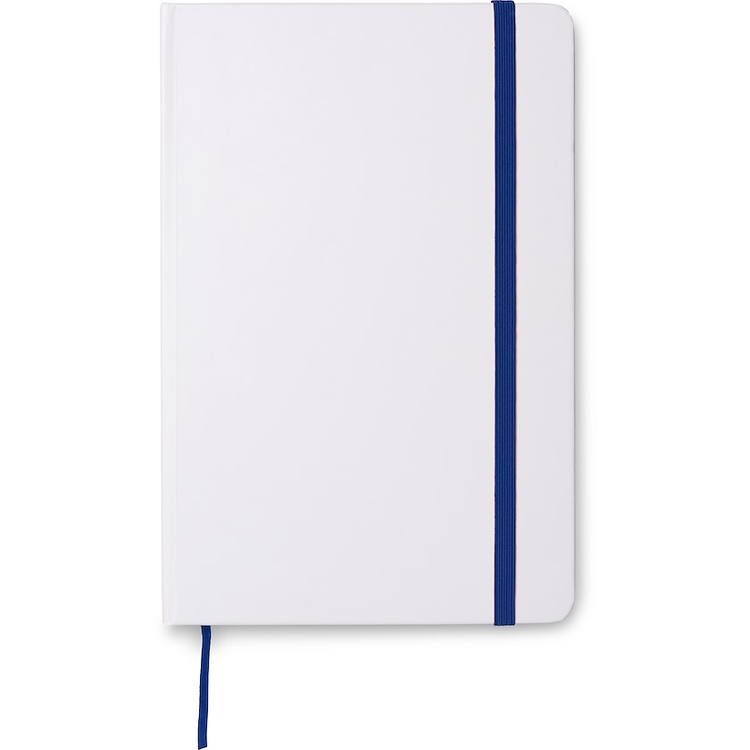 Cahier A5 de 100 pages lignées. Le cahier possède une couverture blanche avec bande élastique et tranche de couleur contrastante.