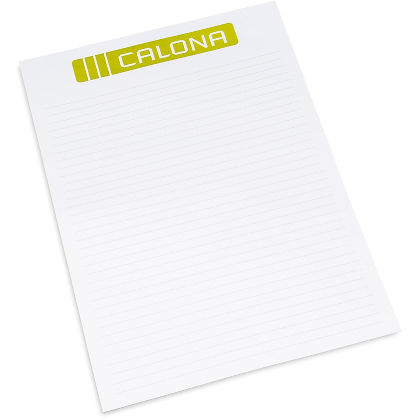 Bloc-notes avec reliure collée au format A4. Choisissez entre 10, 20 ou 30 feuilles. Le verso est en carton. L'impression s'effectue en quatre couleurs maximum selon l'échelle Pantone, et au delà en CMJN.