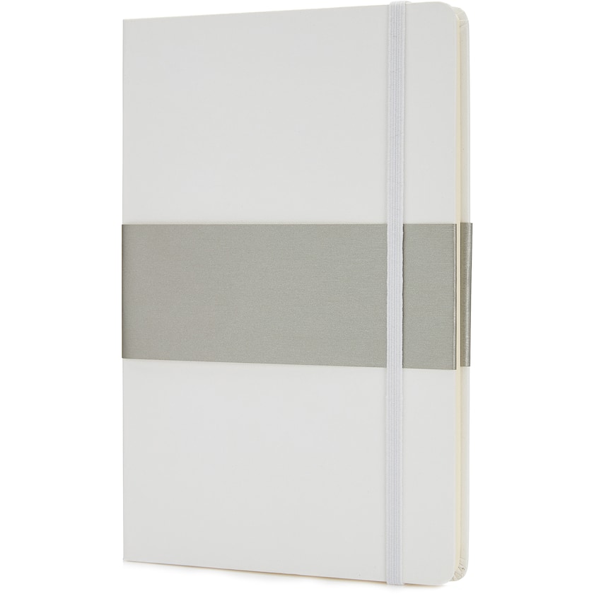 Bloc A5 avec couverture en carton qui recouvre l'avant et l'arrière. Le bloc-note comporte du papier couleur crème avec des rayures noires et une bande élastique qui maintient le bloc fermé.