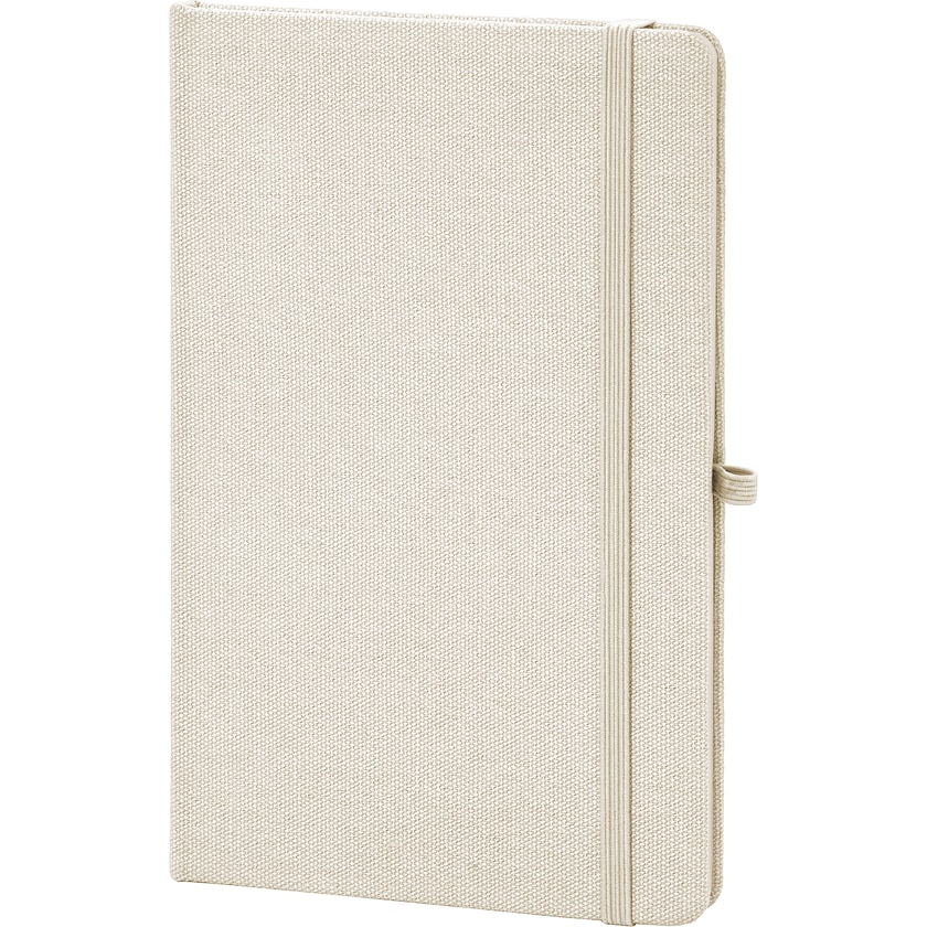 Carnet au format A5 en matière recyclée. La couverture est en coton recyclé et l'insert est composé de 80 feuilles lignées de papier recyclé. Le carnet est équipé d'un élastique, d'un marque-page et d'un porte-stylo.